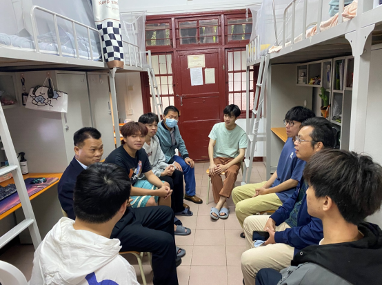 刘怡军队长首先走访了紫薇苑1栋210室,问候各位同学在疫情严峻校园封闭管理下的学习生活状况,关心同学的学习是否受到影响。宿舍同学表示,端州区疫情11月14日爆发突然,但学校反应及时,迅速落实属地防控措施封闭校园管理,有效隔断疫情传入校园,确保校园安全稳定,同时迅速将教学方式从线下转为线上,同时老师也积极备课,保障线上教学也有效落实质有量的完成,同时学校为了学生可以更便捷的进行线上学习,将校园网全面开放发,免费使用,为同学们提供了极大的便利。刘怡军队长表示,学校和老师会继续按教学计划,保质保量的完成对同学们的教学任务,同时也将继续完善学校的生活物资资源,保障同学们在学校的基本生活需求,同时也做好疫情防控工作,为大家创造一个舒适且安心的生活环境。