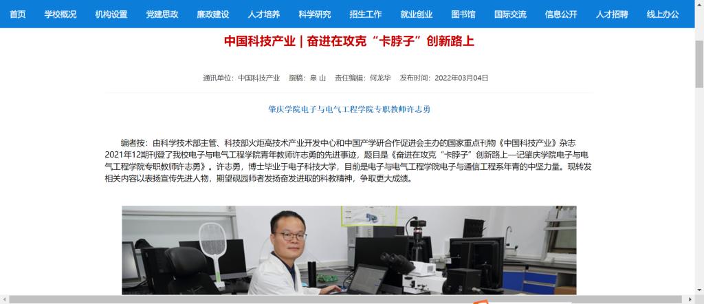 2022年3月4日,砚园头条新闻:转载刊登我院青年教师许志勇先进事迹。