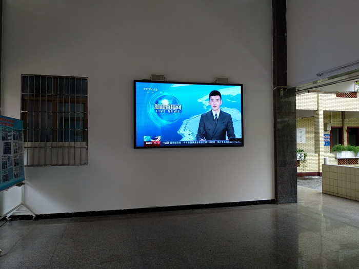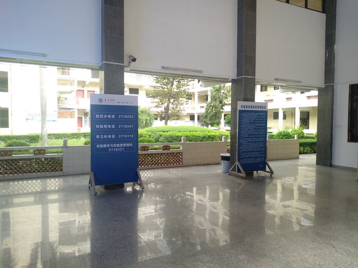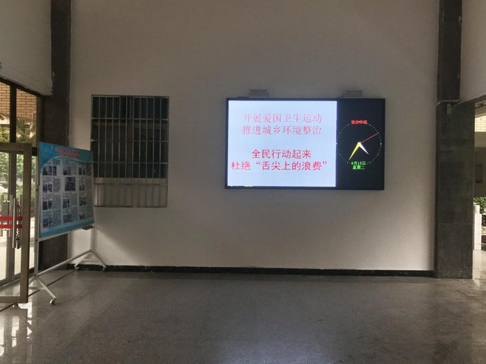 本网讯(记者梁铭贤、赖钧苏)近日师生发现,实验大楼南门中厅有了一些新变化,门口通道干净通畅,大厅美观整齐,特别让人眼前一亮是大厅西侧的电子大屏幕,滚动播放提醒和教育标语,“全民行动起来,杜绝‘舌尖上的浪费’”等,很有时尚感和现代感。