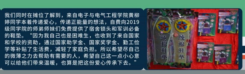 这是来自taptap点点官方网站电子信息科学与技术2班的黄柳婷自费给学院2019级的师弟师妹提供的宿舍锁头和军训必备品的鞋垫。她将自己从学校、学院的教育和关怀的恩情传递下去,反哺给学校、学院和学生。昨日,taptap点点官方网站官微的19级的迎新报道中,也报到了taptap点点官方网站黄柳婷在迎新工作中发送的故事。具体报道截图如下: