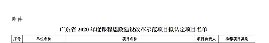 根据《广东省教育厅关于深入推进课程思政建设改革工作的通知》,经资格审核,共评选出广东省2020年度课程思政建设改革示范项目392项(详见附表),其中示范团队84个、示范课程160门、示范课堂148个。
