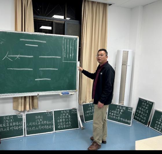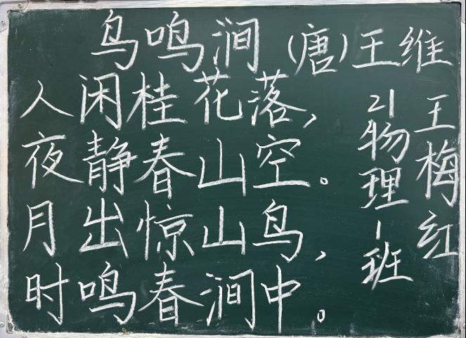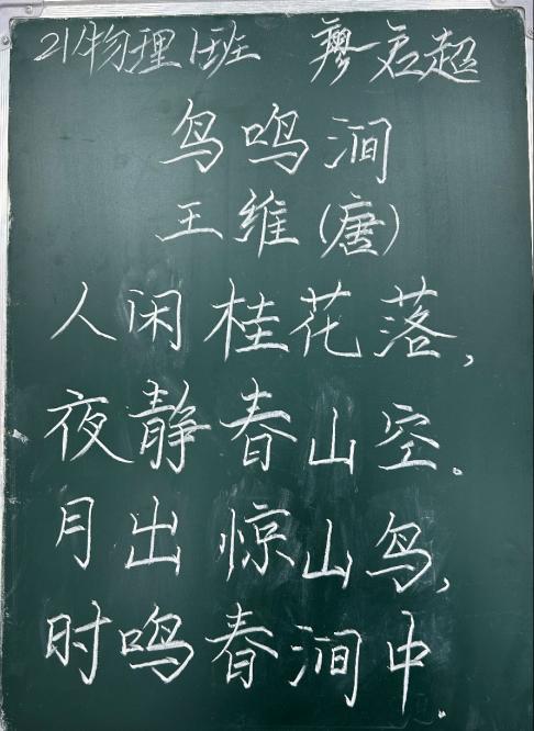 最后进行“粉笔字”比赛,每一位参赛同学拿着小黑板,在既定的时间内开始书写《鸟鸣涧》诗词的黑板字,一笔一划,横折撇捺,同学们认真地书写着每一个字体,一首古诗被同学们灵活灵现地呈现在黑板上。