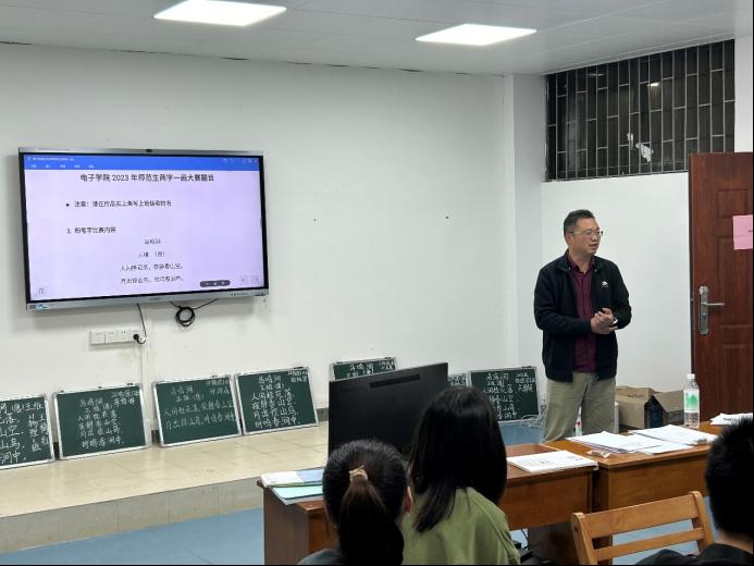 【本网讯】11月22日下午,学院物理学系组织举行了2023年师范生“两笔一画”比赛暨校赛选拔赛活动。2021级物理学师范专业共有43人次参与比赛。评委小组由傅汉球、邱景鸿、于浩和杨丙文共四位老师组成。