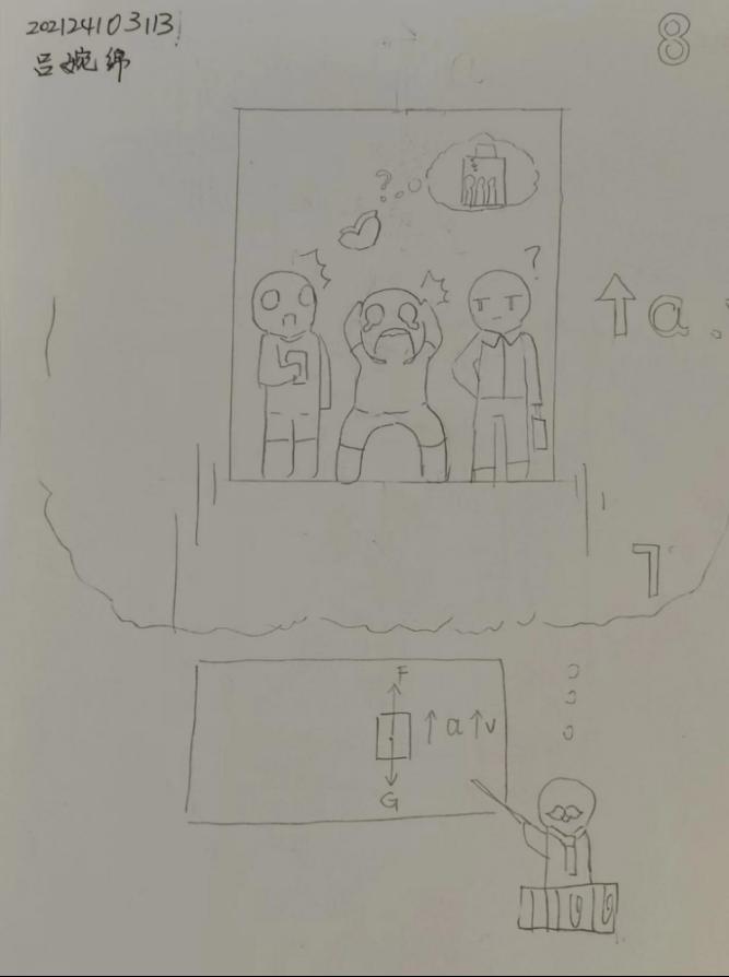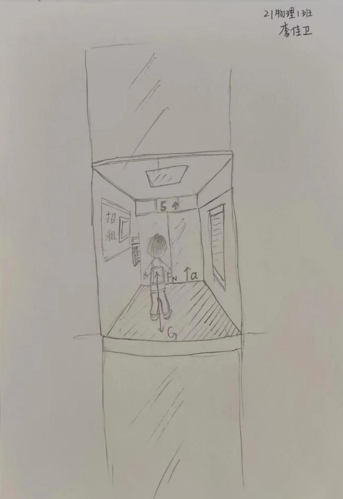 紧接着进行“一画”简笔画比赛。比赛试题是以物理现象和原理为主题,判断人在电梯上升时的受力情况,运用自己的艺术才能展现在纸上。有的同学画出了精致的电梯受力,有的创作了生动形象的简笔人物画作品。这些作品不仅展现同学们对物理学科的理解和掌握,更是艺术与科学结合的完美体现。