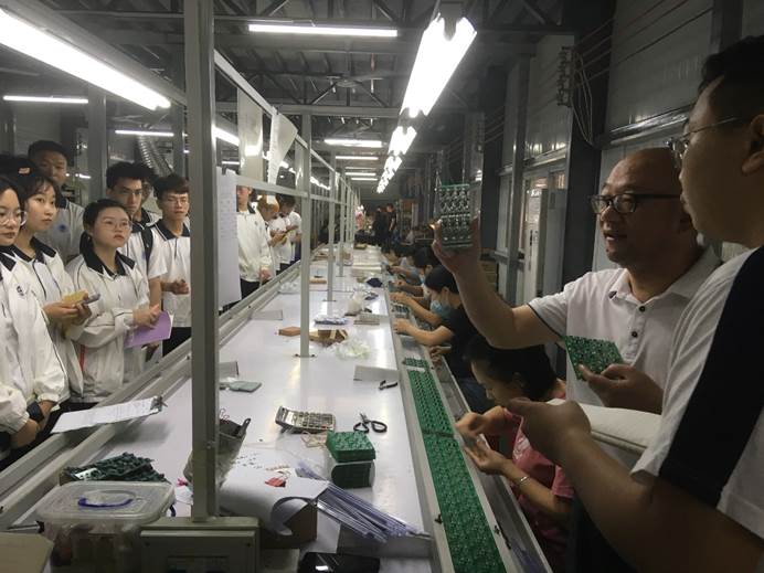 图4 陈博士带领同学参观灯具电源模块生产车间