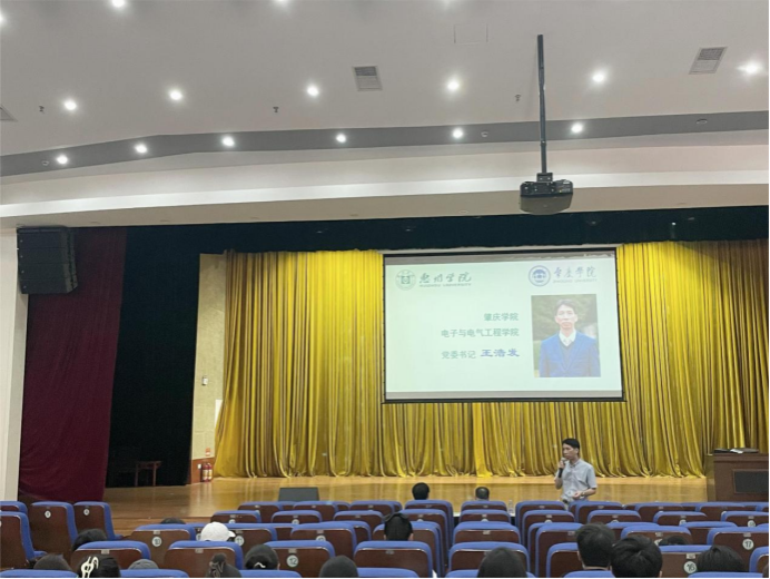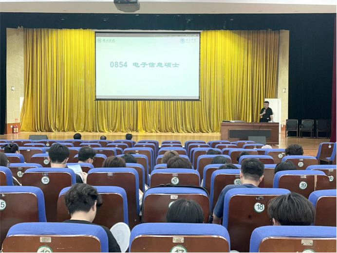 王浩发对我校作了简要介绍。李云鹤进行了具体宣讲,包括电子信息硕士、设计硕士和教育硕士的招生领域、研究方向及成果、硕导情况、研招政策和办学条件,以及往年招生情况等。在互动答疑环节,王浩发、李云鹤就学生关心的录取分数、毕业要求、学习生活条件、奖励政策等问题一一予以耐心解答,并发放研究生招生宣传册。