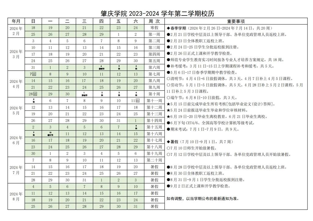 2023-2024学年第二学期校历(2024.2-8)