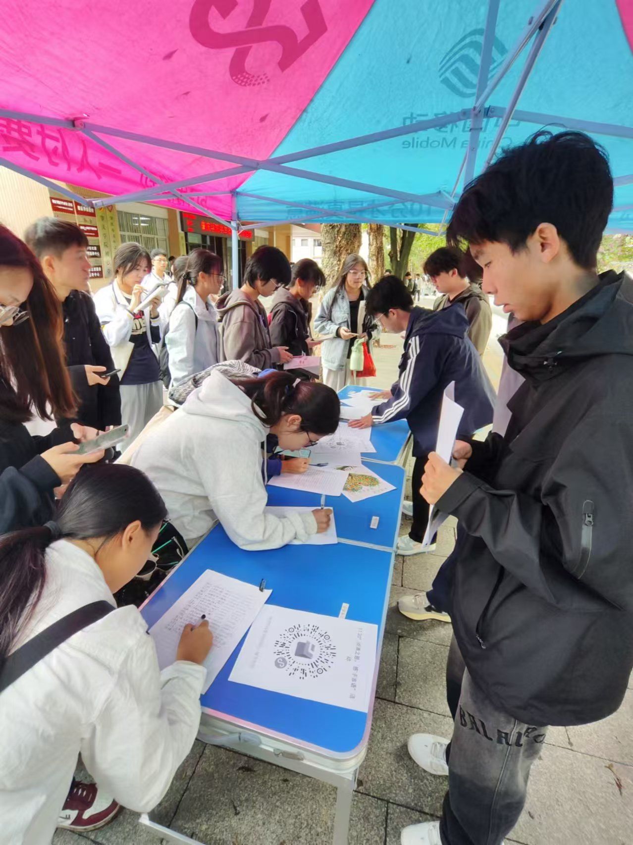 感恩活动旨在弘扬感恩文化,传递正能量,鼓励同学们向生活中的点滴恩情表达感激之情。活动现场,同学们热情高涨,纷纷通过填写便利贴的方式,将心中的感恩之情化为文字,并贴在特设的“感恩树”上。这棵由绿意盎然的便利贴构成的“感恩树”,宛如一棵承载着无数感恩之情的生命之树,它不仅展现了同学们对生活中点滴恩情的珍视与感激,更传递出一种温暖而真挚的情感力量,让在场的每一个人都深受触动。同时,活动还设置了“蚂蚁报恩”卡牌游戏和“识图猜诗”趣味游戏,让同学们在轻松愉快的氛围中深刻感受到感恩的力量和诗词之美。这些游戏不仅丰富了活动的形式,更让同学们在参与中体会到了感恩的深刻内涵。活动期间,工作人员尽职尽责,努力维持现场秩序,为活动营造了良好的氛围。