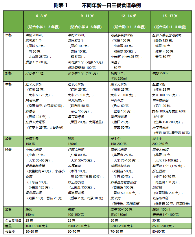 不同年龄段学生的全天各类食物的供给量的标准见下表。一日三餐应提供谷薯类、新鲜蔬菜水果、鱼禽肉蛋类、奶类及大豆类等四类食物中的三类及以上,尤其是早餐。