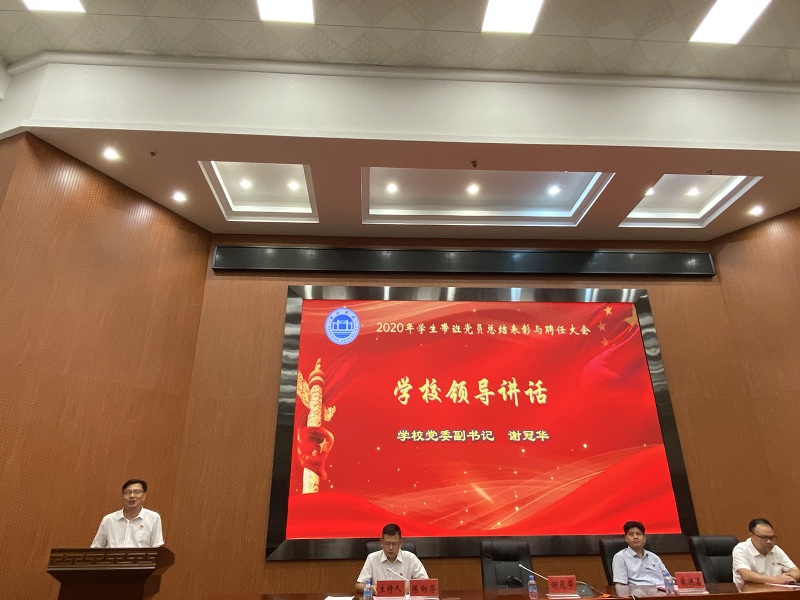 表彰后,校党委副书记谢冠华在讲话中希望学生带班要勇于奉献,要把自己和国家的未来和民族的发展联系在一起、学习共产党员的奉献精神,牢记共产党员的初心和使命,争做一名优秀的带班党员。