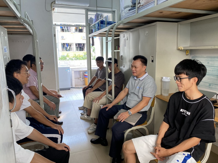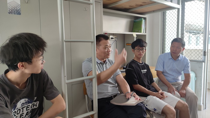 刘怡军队长首先来到力行书院1栋353室,认真查看宿舍设施、环境卫生、消防安全等情况,关心询问了解新生同学们的学习生活情况。当了解到新同学来到学校已适应大学生活,对学校总体印象很满意时,刘队长表示感谢。新同学们也提了一些问题和建议,如博学书院运动场灯光暗不利运动、热水建议全天供应等,刘队长结合上级政策和学校实际作解释回应说,学校会进一步加强和改善校园设施,提供生活方便,让同学安心学习。