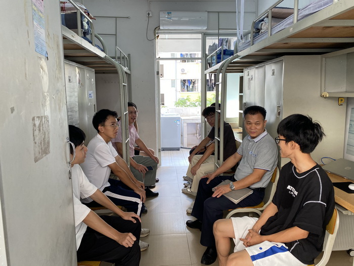 本网讯:10月26日上午8点30时,广工帮扶队队长刘怡军一早深入基层联系学生,走访taptap点点官方网站22级物理学1班学生宿舍。taptap点点官方网站党委副书记傅汉球,辅导员郑安徽、刘浏陪同走访。