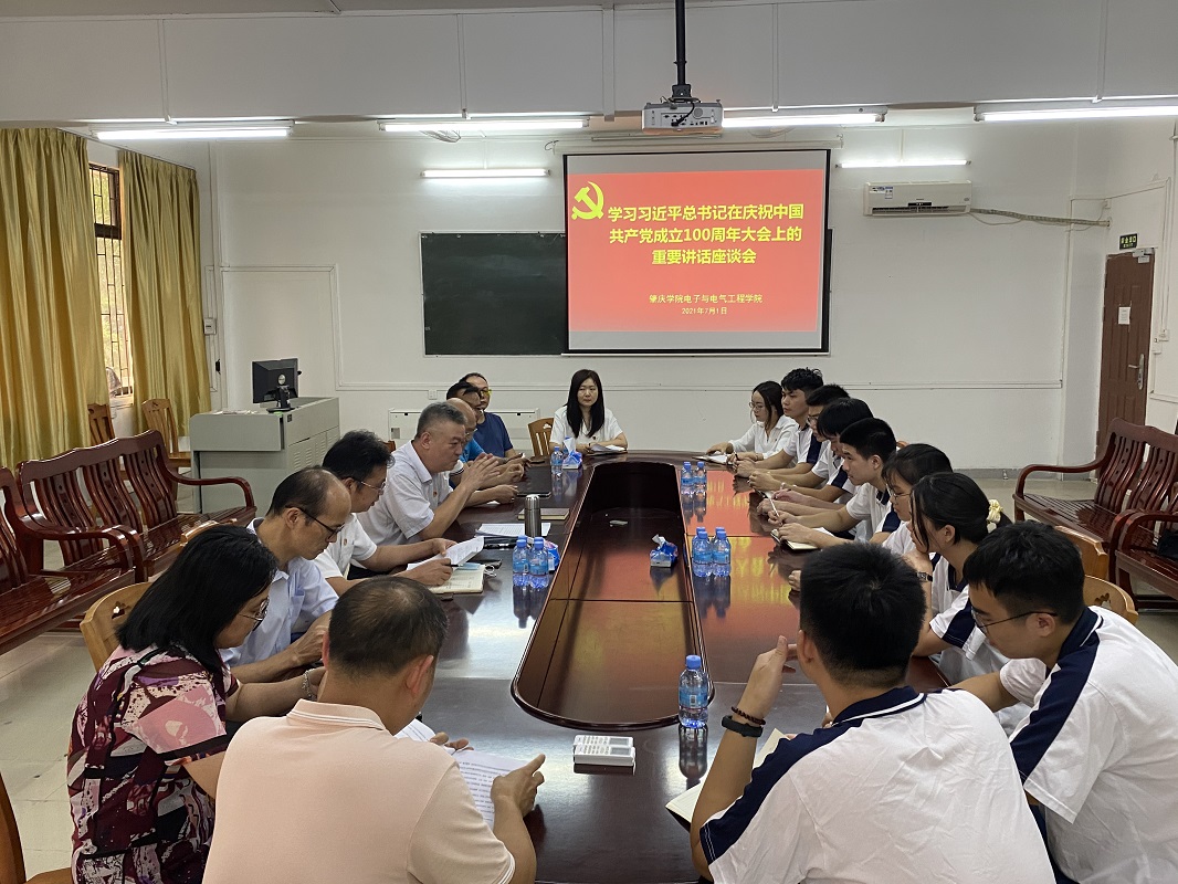 活动二:下午2点30分,我院于实验楼208室开展学习习近平总书记在庆祝中国共产党成立100周年大会上的重要讲话精神座谈会。党委委员、行政领导班子、统战成员、师生代表等参与了本次座谈会。