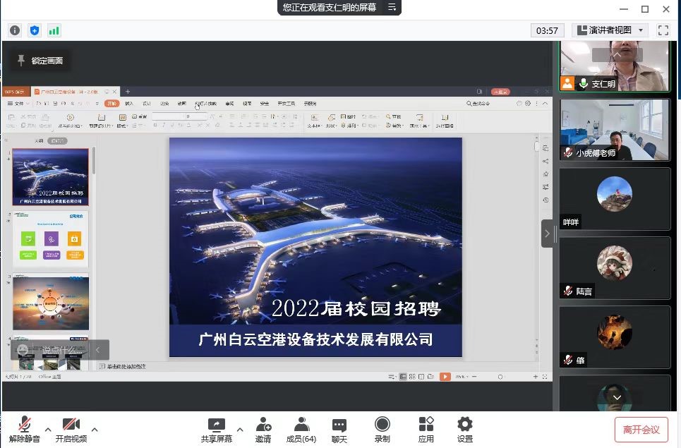 共克时艰战疫情,就业服务不停歇,为进一步推进2022届毕业生就业工作,2022年3月23日下午,我院在腾讯会议平台举办线上宣讲会,广州白云空港设备技术发展有限公司主管、学院党委副书记傅汉球、毕业班辅导员刘雨阳老师、我院2022届毕业生参加此次宣讲会。宣讲会由傅汉球副书记主持。