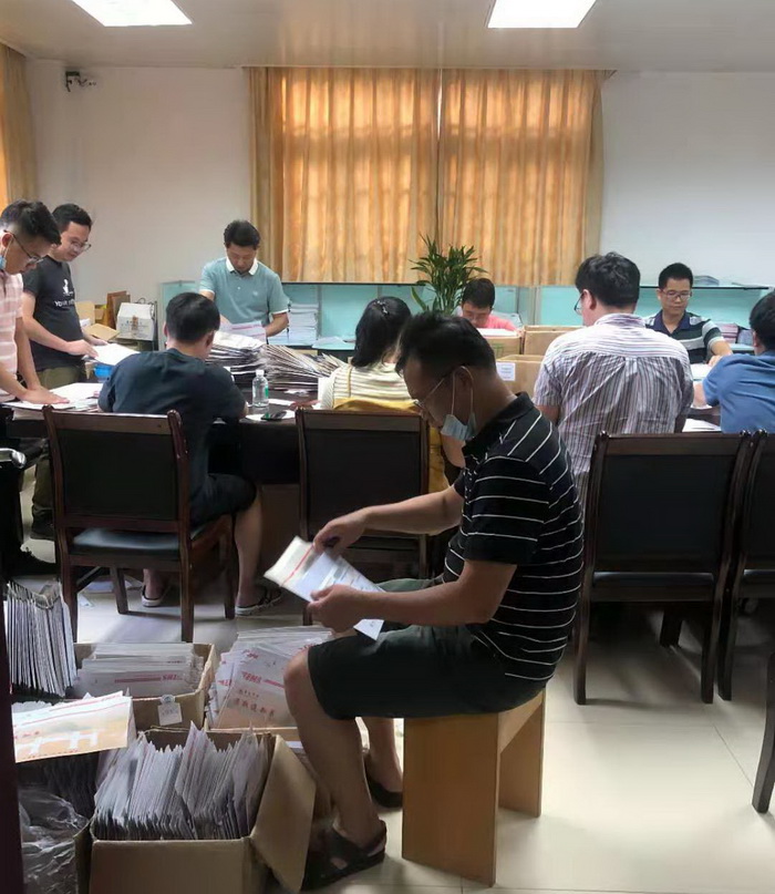 8月2日,2021级新生录取通知书核对装袋,感谢杨丙文,陈显明,杨志中,任瑾、傅汉球等老师参加整理工作,通力合作,把650份录取通知书整理完毕,等待邮政寄出。