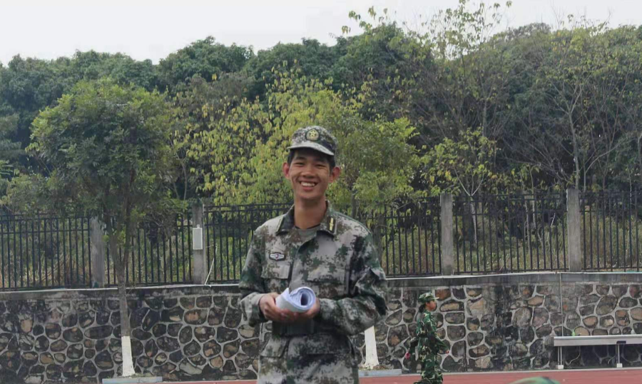 他是19年退伍的一名学生,在训练场上,烈日当空、练军姿、踢正步、单双杠、三公里,武装五公里,野外拉练,晴天一身汗,雨天一身泥。