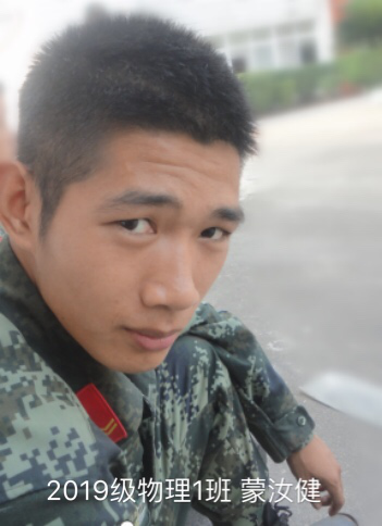 我叫蒙汝健,一名退役士兵,也是一名大一新生。军旅很多时候不能用“苦”来形容,但不得不说,很有意义,从棍术、刺杀到擒敌格斗,从卧姿、跪姿到急速射击,从预备特到极限训练,从默默忍受到坦然接受,自己在一点一点成长,去调整自己的心态,去制定自己的计划,去实现自己的想法,在做好自己该做的前提下,不断去尝试自己想做的;和战友共同努力,共同承受,相互扶持,共同进步,为班集体第一而努力。