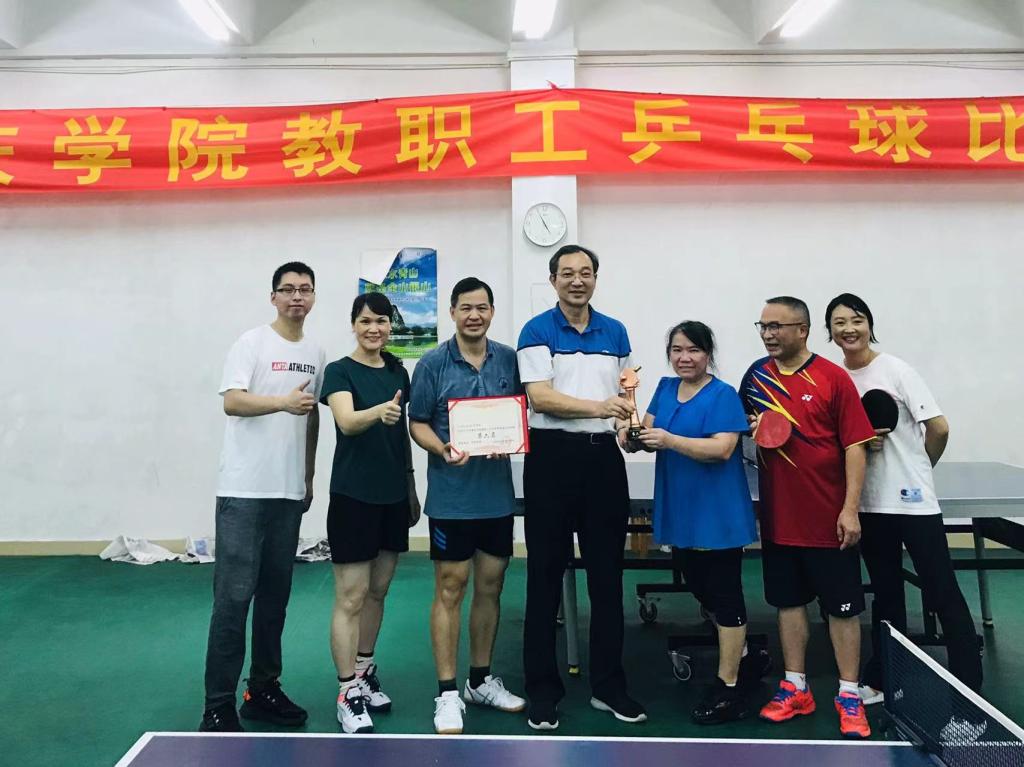 在保级的关键一场,双方难解难分,我院的队员们苦战两个多小时,凭着刘伟平老师临危不乱,在女单决胜局冷静反超,以及刘立程副院长在男单凭着实力抛离对手,甲组保级成功,荣获全校第六名。