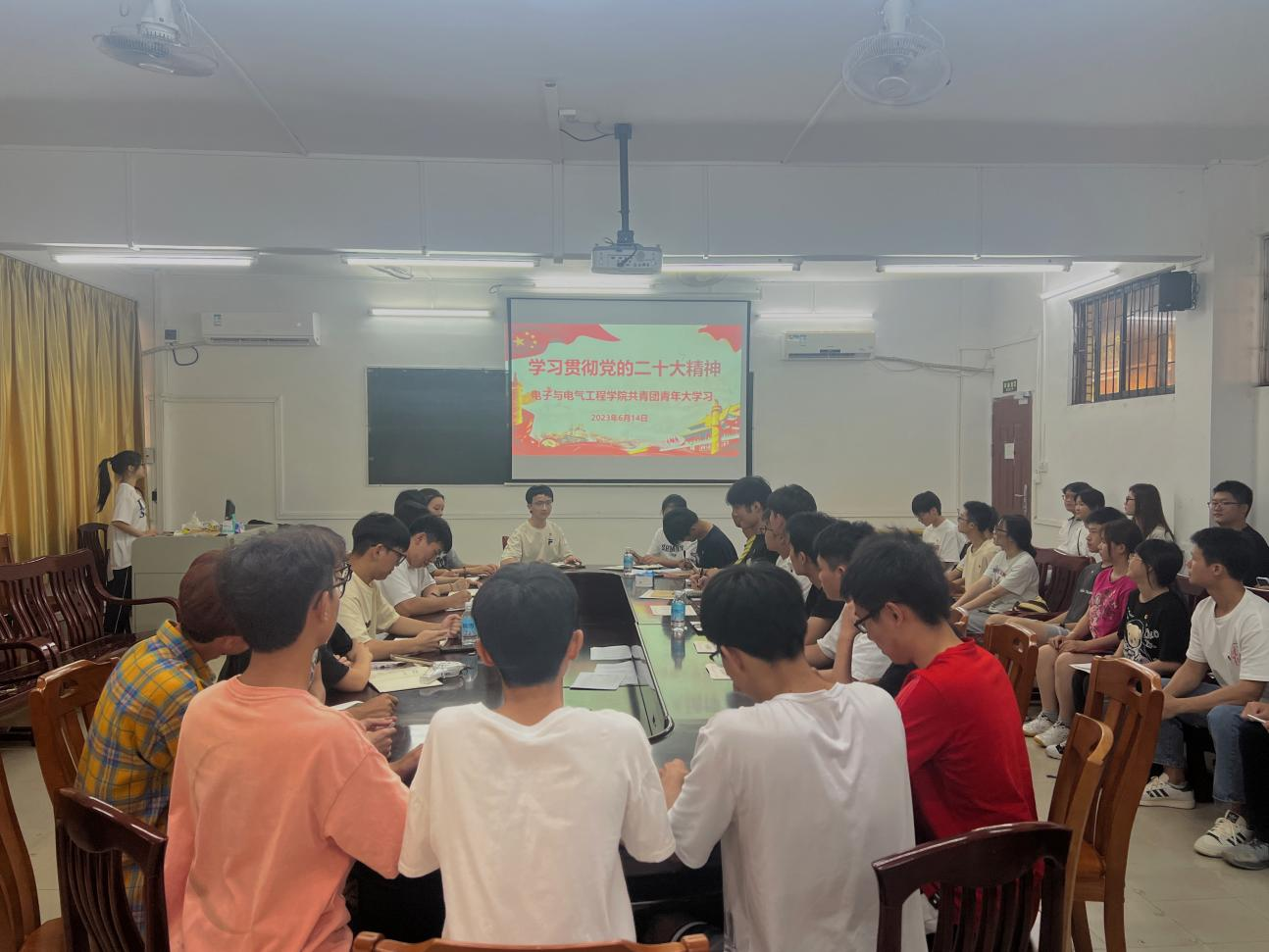 本网讯 2023年6月14日中午,我院在实验大楼208会议室开展“学习贯彻党的二十大精神”主题团课。本次主题团课由院团委书记邱景鸿老师主讲。参加本次团课有院团委副书记陈琦,学生会负责人廖立琪以及团委学生会各部门负责人及工作人员。