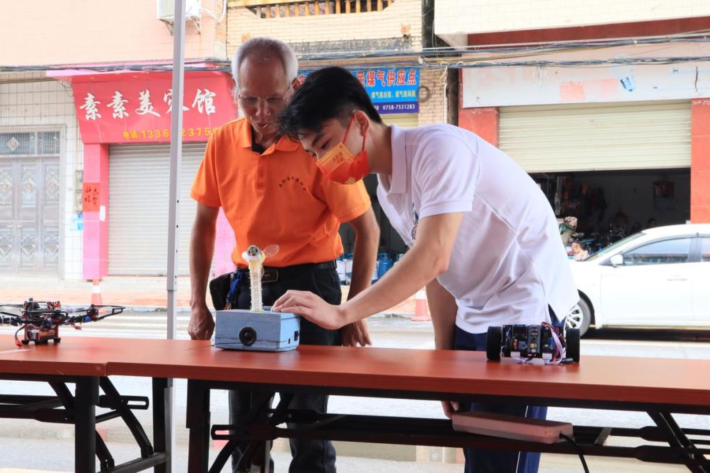 经过一番布置,“义务维修小家电,贴心为民办实事”科技作品展在播植社区党群服务中心正式开始。实践队科技展演组队员向当地群众宣传讲解科技知识和国家科技发展状况。实践队成员表示展演时虽然累,语言沟通有些许不畅,但自己独立制作的科技作品被村民不断点赞认可时,即使身处在炎热的天气中也会心情也无比舒爽。