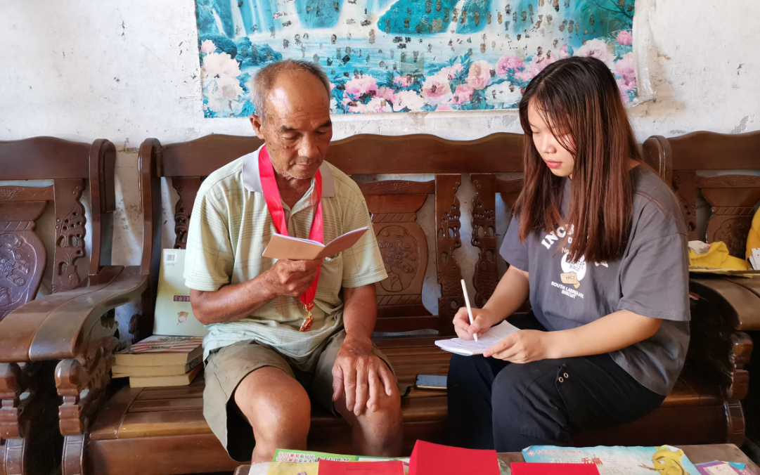 除了开展红色革命遗址参观学习、重走红色足迹。学院三下乡团员成员还努力追寻红色记忆、访谈红色人物、挖掘红色故事。为了让红色文化深植青年团员心中,深切感悟党的百年光辉历程,7月12日,调研团成员前往广东阳江访谈老党员林平广。